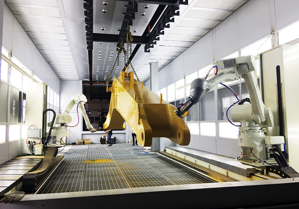 此外,挖掘机动臂斗杆喷涂自动生产线、米兰网址铲斗焊接自动生产线上,各种机器人系统正在各条生产线上有序运转。在相同产能下,每班人员仅需2人,人员减少12人,场地减少一半,物料流转次数减少3倍。